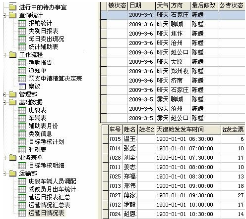 数据录入 从图中不难看出,天津津宇运业有限公司的方向、车号、驾驶员的录入根据勤哲Excel服务器基础表信息(人员、对应的班线车号驾驶员)提供点取,很快捷准确不用再次敲入汉字,而且保持基础表与以后生成的报表信息的一致性。