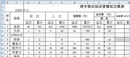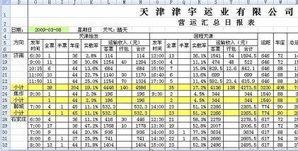 数据统计 在选择日期后,天津津宇运业有限公司根据《运营日报情况》对每日、每条班线自动进行汇总并按照标题项目对应填充到表格内。