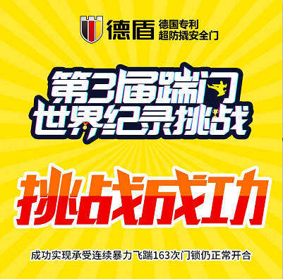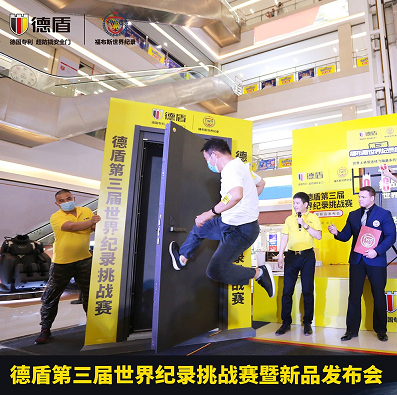 163次的惊天成绩,德盾再一次创下了世界纪录!9月5日,德盾第三届世界纪录挑战赛——武汉站圆满结束,当见证官宣布163次的成绩真实有效时,“世界上承受连续飞踹最多的安全门”这一纪录再次被刷新,这也意味着德盾成为行业内第一个也是唯一一个连续三次成功挑战世界纪录的安全门品牌!