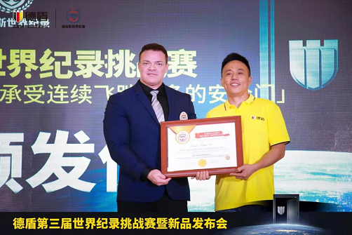 挑战成功后,福布斯世界纪录官方认证官Michael Yen将证书颁给德盾中国区执行总裁卢华升,正式标志着德盾又一次谱写了门业新传奇!