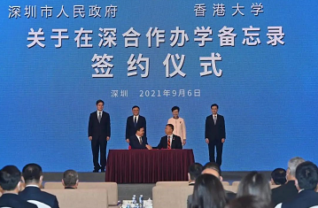 深圳教育局官方微信消息,9月6日,深港高层会晤暨深港合作会议在深圳举行。在香港特别行政区行政长官林郑月娥、深圳市委书记王伟中和香港特别行政区政务司司长李家超、深圳市市长覃伟中共同见证下,深圳市副市长郑红波与香港大学副校长宫鹏签署《深圳市人民政府 香港大学关于在深合作办学备忘录》,市校在深合作共建香港大学(深圳)(暂定名)。