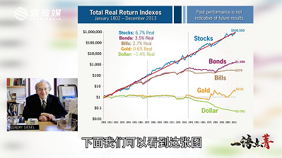 下面我们可以看到这张图是美国经济学家西格尔编的一张图,这张图表示的是1801年到2001年这两百年间,美国人持有的资产形态所导致的财富的差异。如果当初你持有的是实物黄金,你的财富几乎没增长。你只有持有股票才能追平财富的增长,才不至于在社会的发展中出现相对地位的下降,不会逐渐地沦入贫困阶层。这就是为什么美国的养老金都在股市里面,所以这就是一个状态。