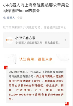9月7日,小i机器人官微发布消息称,小i机器人向上海市高级人民法院提起要求苹果公司停售iPhone的禁令。