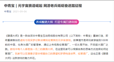 据了解,中青宝两日连续涨停,是由于9月6日在公司微信公众号发布的文章称,即将推出虚拟与现实梦幻联动模拟经营类的“元宇宙”游戏《酿酒大师》。这款“元宇宙”的游戏,可以将虚拟映射到现实中,用户可以在游戏中体验现实,也可以在现实中触碰游戏。这种映射体现在游戏中玩家自己“亲手”酿的酒,可以在线下提酒。