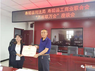 会议宣读了《寿阳县司法局、寿阳县工商业联合会关于建立“万所联万会”机制实施方案》,为律所律师发放了聘书,为“寿阳县司法局律师服务企业工作站”揭牌。部分企业家、商会代表,寿水律师事务所负责人分别做交流发言。