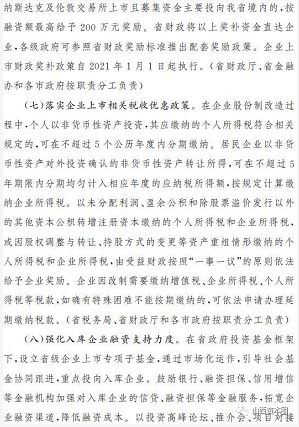 《"倍增计划》中对企业境内外上市或挂牌省财政均将给予资金补助,其中对企业在境内成功上市累计可获300万元奖励;对在沪深交易所“借壳上市”并将注册地迁回我省的企业,以及主动迁入我省的 A 股上市公司,分别给予300万元奖励;在“新三板”挂牌的给予100万元奖励,进入精选层的再给予100万元奖励;在山西股权交易中心“晋兴板”挂牌的给予10万元奖励,从挂牌之日起, 当年首次实现直接融资的再奖励10万元。另外,境外上市融资亦有望获得最高200万元奖励,且各级政府可参照省财政奖励标准推出配套奖励政策。