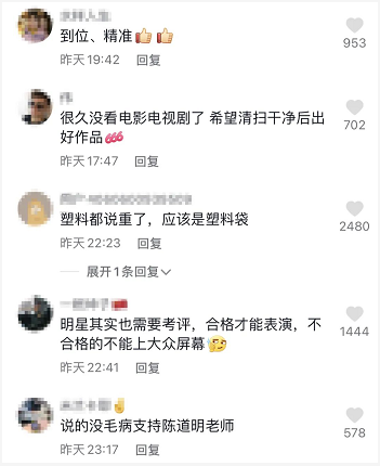 还有人想起了因郑爽“天价片酬”“偷税漏税”等事件,受牵连、无辜被骂的张国立和60后女演员郑爽,直呼陈道明说的没毛病,“有些演员就是害群之马,害人害己,把整个圈子都弄得乌七八糟的。”