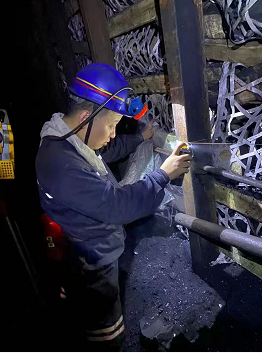 图为袁鑫正在掘进工作面进行腰线标设工作