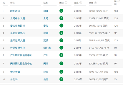 在世界已竣工的10大高楼中,中国占了6席,包括: