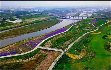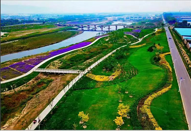 此外,绿化河堤行道5.6千米,平整河堤外坡面4万平米、自然式驳岸3080平米,植草格砖及土工格室2.65万平米,栽植地被植物1800平米,园路三七灰土完成2.35万平米,草亭基础浇筑完成17个,安装喷灌管线2.8千米。
