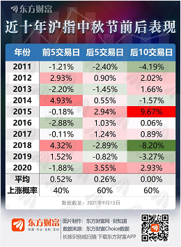 东方财富Choice数据显示,2011年至2020年的10年间,沪指在中秋节后的市场表现要优于节前。节前5日(交易日,下同)各有6年下跌,4年上涨,上涨概率为40%。而节后表现相对较好,10年中,节后5日、后10日均有6年上涨、4年下跌,上涨概率均为60%。
