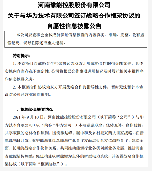 至于说,今天豫能控股缘何强势涨停,这就和昨晚豫能控股的一份公告,说要和华为战略合作密切相关了。