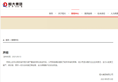 9月13日,恒大集团网站发布声明称,网络上近日出现的有关恒大破产重组的言论完全失实。公司目前确实遇到了前所未有的困难,但公司坚决履行企业主体责任,全力以赴复工复产,保交楼,想尽一切办法恢复正常经营,全力保障客户的合法权益。