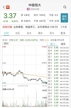 截至收盘,中国恒大下跌近7%,报价3.37港元/股,市值449亿港元;恒大汽车下跌超过7%,报价5.15港元/股,市值503亿港元;恒大物业下跌2.55%,报价4.58港元/股,市值495亿港元。