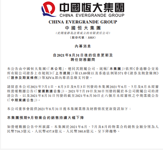 恒大集团14日在港交所早间公告,集团于2021年6月、7月及8月的物业合约销售金额分别为人民币716.3亿元,人民币437.8亿元,人民币380.8亿元,呈下降趋势。
