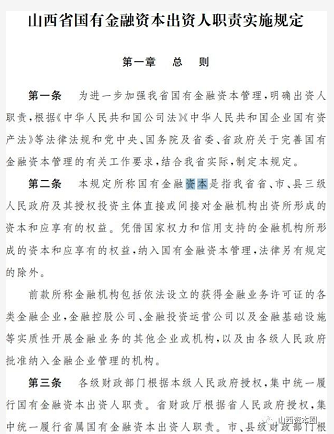 近日,山西省政府官网对外发布已于8月31日印发的《山西省国有金融资本出资人职责实施规定》,共涉及七章三十九条内容。