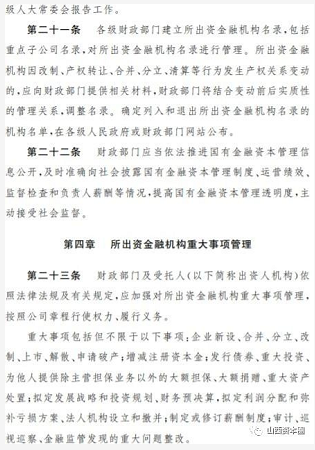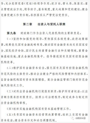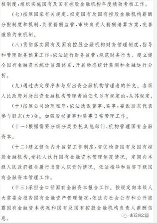 山西资本圈注意到,《规定》明确了国有金融机构出资人与受托人职责,国有资本管理与监督,所出资金融机构重大事项管理,金融机构管理者选择、考核和薪酬管理,责任追究等核心内容。