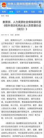 记者14日从教育部获悉,教育部、人力资源社会保障部日前联合印发《校外培训机构从业人员管理办法(试行)》,将进一步加强校外培训机构从业人员管理,保障“双减”改革任务落实。