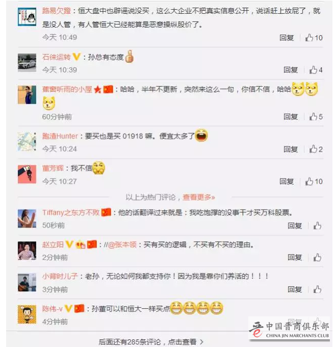 孙宏斌微博辟谣之后,万科A股和H股有所走软,但仍然涨幅明显。鉴于此前恒大买入万科之后,曾先否认后承认,所以股民仍心怀期待。甚至有股民都替孙宏斌“反水”想好了理由:微博很久不用了,被人盗用了。