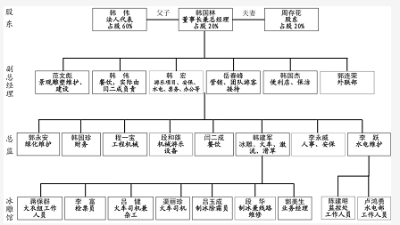 该公司于2014年12月3日注册成立,法定代表人韩伟,董事长兼总经理韩国林为实际控制人,该公司为家族式企业(公司股权构成及组织结构见图1),现有正式员工107人,同时根据季节性需要临时聘用100余人。该公司投资运营的台骀山滑世界农林生态游乐园(以下简称“台骀山游乐园”)项目位于太原市迎泽区郝庄镇小山沟村,2013年3月开工建设,2014年7月开始对外营业,逐步建成滑世界乐园、碉堡文化园、根祖文化园、野生植物园四大主题园,年接待游客约40万人次,高峰期每天游客约5000人次,平时约1000人次。