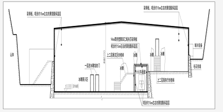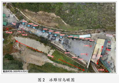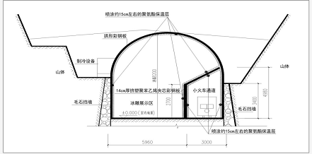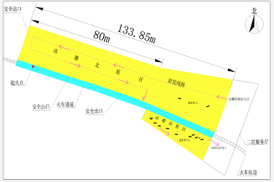 2.总体结构情况。冰雕馆(见图2)项目位于台骀山游乐园西北处,依山谷而建,南北两侧为山体,东西长133.85m,东口宽32.8米、西口宽8.96米(东西口剖面图见图3、图4),高8.2米,总建筑面积为2258平方米。冰雕馆主体为钢架结构,南北两侧外墙4米以上用彩钢板围护,顶部为彩钢板封闭。内部喷涂约15厘米厚的聚氨酯作保温层,同时用约14厘米厚的聚苯乙烯夹芯彩钢板隔离成两个相对独立的部分,南侧为小火车通道,北侧为冰雕游览区(主体建筑一层、局部二层)。小火车通道照明线路均采用铰接方式连接,敷设在聚苯乙烯夹芯彩钢板上,并被聚氨酯保温材料覆盖。冰雕游览区共有5个安全出口(见图5),分别是东侧一楼入口、东侧二楼出口、西侧出口、南侧2个出口。小火车通道内有10个应急照明灯具、5具灭火器;冰雕游览区内有2个应急照明灯具,灭火器24具。