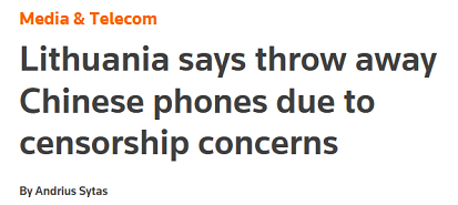 据路透社9月22日报道,立陶宛国防部日前公布一份产品调查报告,声称在部分中国企业生产的手机中发现文字审查功能,并以此为由煽动该国消费者避免购买中国手机,若民众目前持有中国产手机,立陶宛国防部也“建议”将这些设备扔掉。