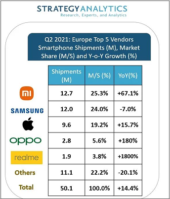 2021年二季度,小米更进一步。调研机构Strategy Analytics发布的数据显示,小米二季度以出货1270万部手机、25.3%的市场份额,首次超越三星位居欧洲第一,出货同比增长67.1%。