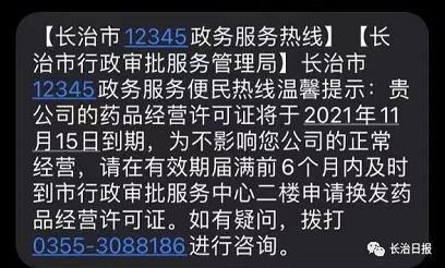 在日常工作中,工作人员发现,有不少企业因各种原因,往往错过证照延续换证的法定期限,从而造成证照作废,影响正常生产经营。针对这一情况,市行政审批服务管理局在持续健全证照主体基础数据库的基础上,推出证照延续提醒服务,全面梳理延续提醒服务清单,对于短时间内需要办理延续换证手续的市场主体,依托12345政务服务便民热线,开展“点对点”前移服务,通过电话、短信等形式,提醒企业按法定时限要求及时办理相关业务。首批推出的《药品经营许可证》《医疗器械经营许可证》《食品生产许可证》审批事项延续换证提醒服务,受到企业和群众的一致好评。长子县勇芳大药房相关负责人牛红芳感慨:“现在开药店,不仅审批手续办得快,服务还这么周到,专门打电话发短信提醒,真是贴心”。