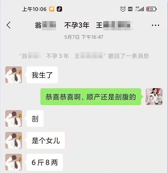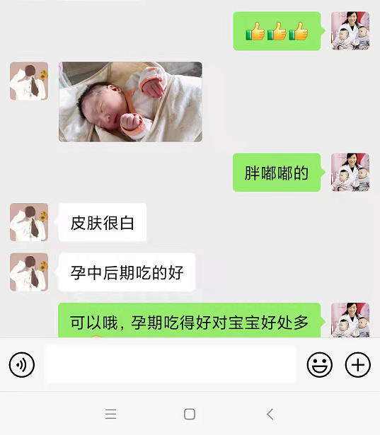 5月7日,翁女士顺利产女,重6斤8两。她也在第一时间通过微信向唐仕珍主任报喜感恩。在得知自己的闺蜜伍女士也有同样的困扰后,出于对送子鸟的信任以及对唐主任的肯定,翁女士推荐闺蜜来院找唐主任帮忙看看。现在,伍女士也幸运地怀上了。幸福通过医患互信、互爱的方式,从一家延续到另一家,点亮传承的灯火。我们祝福伍女士平安度过妊娠期,早日卸货,再为送子鸟宝宝家庭添一员可爱的小天使。