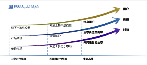 生态品牌与前两种品牌有非常突出的差异化:产品品牌脱胎于工业经济,平台品牌则依靠流量经济,但生态品牌是体验经济,创造用户体验;从时势上看,产品品牌和平台品牌是单边市场或双边(多边)市场。但生态品牌形成了共同进化的生态;从价值角度,产品品牌是质量溢价,平台品牌是流量溢价,但生态品牌是实现了价值自循环;从用户角度,前两种品牌只有顾客交易没有用户,而生态品牌创造的是终身用户。这些都是第四次工业革命所需要的。