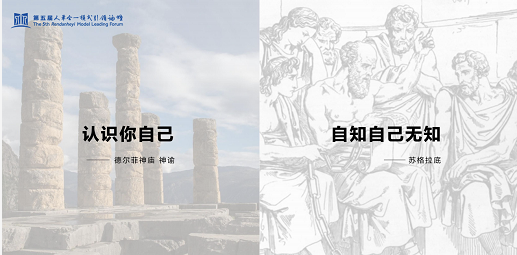 “认识你自己”是被称为西方哲学之父的泰勒斯所说的,但是真正被熟知是因为苏格拉底。苏格拉底的朋友到这个神庙去求神谕,得到的是说苏格拉底是最有智慧的人。苏格拉底听后遍访希腊当时非常有智慧的名人去求证,但发现所有人都认为自己有某方面的智慧,所以苏格拉底最后得出一个结论,就是之所以他被认为有智慧,是因为他“自知自己无知”。苏格拉底从来没有想要提出什么新的思想,而是要成为新思想的助产士,帮助别人产出新思想。所以,今天所讲的这一切,就是要让每个人把自己的潜在能力都发挥出来,实现德鲁克所说的,让每个人成为自己的CEO。