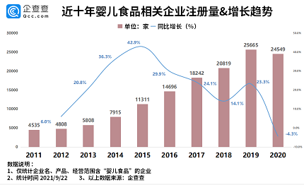 数据显示,目前我国现存“婴儿食品”相关企业超过11.2万家,近十年相关企业注册量呈增长趋势,近三年的注册量累计超7.1万家,其中2018年注册量首次突破2万家;2019年是注册量最多的一年,共注册了2.57万家企业,同比增长了23.3%;2020年共注册了2.45万家相关企业,同比下跌了4.3%。