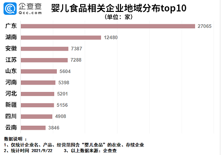 从企业省份分布来看,广东省以2.7万家企业超过其他省份,其次是湖南省、安徽省。从城市分布来看,婴儿食品企业排名前三的城市是广州、长沙和合肥。