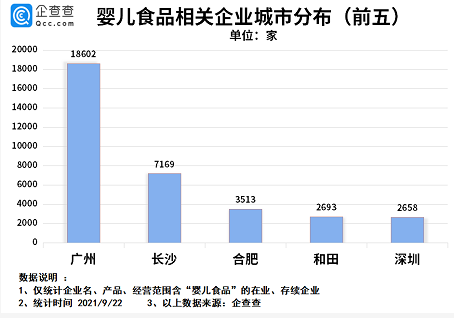从城市分布来看,数据显示,我国现存婴儿食品相关企业主要分布在广州、长沙、合肥等城市。其中广州市的企业量遥遥领先,为1.9万家。其次,长沙市有0.7万家企业排全国第二;合肥排名第三,有0.4万家相关企业。