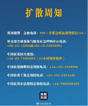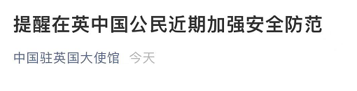 使馆提醒在英中国公民近期外出提高警惕,遇不良分子挑衅,尽快设法脱身,记住对方体貌特征并及时报警。紧急情况下请联系中国驻英国使领馆寻求协助。