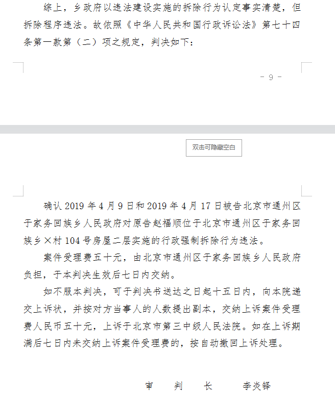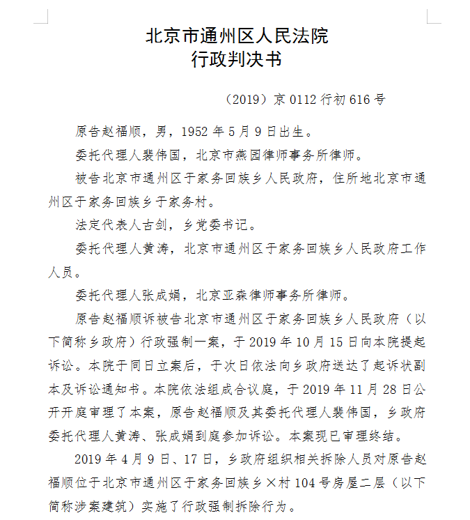 2019年10月15日赵福顺向北京市通州区人民法院提起诉讼,于2020年1月13日确认2019年4月9日和2019年4月17日被告北京市通州区于家务回族乡人民政府对原告赵福顺位于北京市通州区于家务回族乡×村104号房屋二层实施的行政强制拆除行为违法。