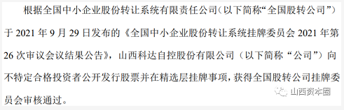 9月29日,山西新三板挂牌公司山西科达自控股份有限公司(简称“科达自控”)精选层小IPO申请成功“闯关”,获全国中小企业股份转让系统挂牌委员会审核通过,此举意味着科达自控将成为山西首家精选层挂牌企业,甚至有望成为北交所山西“第一股”。