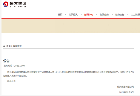 10月9日凌晨,恒大集团发布公告称,恒大集团6名提前赎回恒大财富投资产品的管理人员,已于10月8日前将所有提前赎回的款项全额归还到恒大财富指定账户。公司已对上述6名管理人员进行问责惩处。