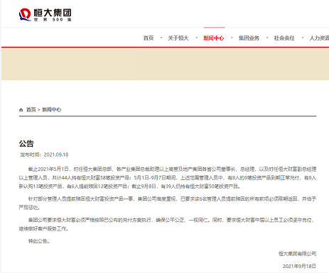 此前,9月18日,恒大集团发布公告称,针对部分管理人员提前赎回恒大财富投资产品一事,恒大集团高度重视,已要求该6名管理人员提前赎回的所有款项必须限期返回,并给予严厉惩处。
