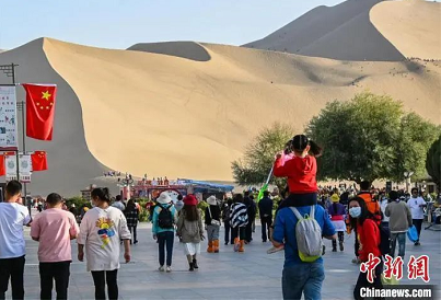 国庆长假,大批游客前往鸣沙山月牙泉景区参观游览。 王斌银 摄