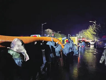 救援过程中,综合救援队又接到市防汛抗旱指挥部命令,要求前往清徐县执行救援任务。综合救援队当即分成两组,一组留守小站营小区,另一组携带重要设施设备转场清徐县。10月7日晚6时,综合救援队的队员来到清徐县象峪河桥指定救援现场。新的困难出现在队员们面前,由于现场道路并未硬化,土质松软,救援车辆无法靠近。关键时刻,没有任何犹豫,队员们一起肩扛手抬,将一台台大型抽水设备放置在指定位置,开始抽水作业。