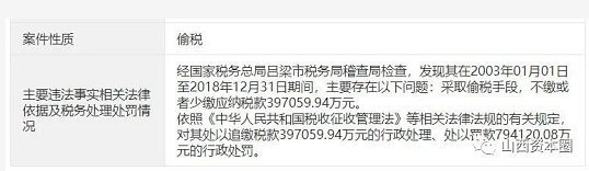 可不容忽视的是,虽然随着实控人李增虎被宣判和公司被托管经营后迎来“新生”,海威钢铁已成“过去时”,但官方披露的海威钢铁及关联公司在存续期间的偷税情况至今来看仍然触目惊心。山西资本圈注意到,经吕梁市税务局稽查局检查,仅海威钢铁在2003年01月01日至2018年12月31日期间通过采取偷税手段,不缴或者少缴应纳税款便高达近40亿元,而曾有媒体报道官方此前累计查扣李增虎涉黑组织资产约23亿元。
