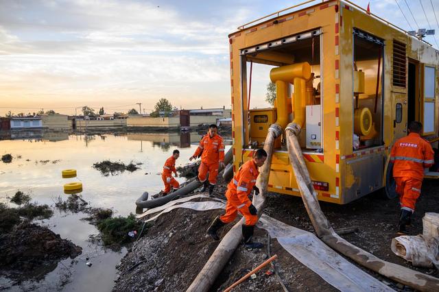 2021年10月10日,山西省介休市,洪水倒灌义安镇桑柳树村,救援人员使用大型设备排洪。图据IC photo