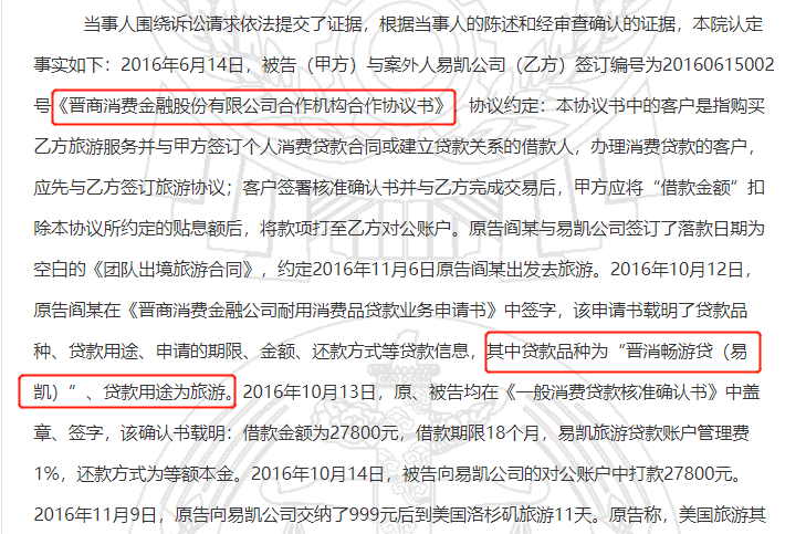 在对晋商消费金融近期相关裁判文书的梳理过程中,记者发现,晋商消费金融就曾在旅游分期场景中遭遇踩雷事件。今年8月份,太原市地方人民法院披露了多份消费者和晋商消费金融的合同纠纷案,案件均涉及山西易凯国际旅游公司。