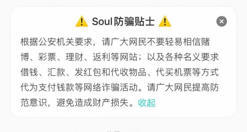 在用户保护教育方面,Soul针对注册用户完整生命周期进行UGC推送。针对刚注册的新用户,Soul平台系统将向其自动推送《星球防骗指南》,以图文和案例的形式传递防诈骗知识。针对日常普通用户,Soul则设置“Soul官方风纪球长”防骗账号,定期发布网络典型骗术的警示提醒,并专门成立“Soul星球护卫队”,对骗子和诈骗信息进行广泛收集,不断清理,并通过在广场推荐,保证防骗知识触达用户。