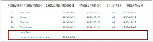 大自然不受政治边界的限制,环保组织“自然运动”的负责人布莱恩·奥唐奈(Brian O’Donnell)说,要达到《生物多样性公约》的目标需要国际合作和协调,美国的缺席会使这一目标更难实现。