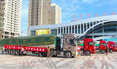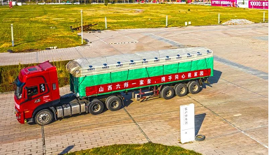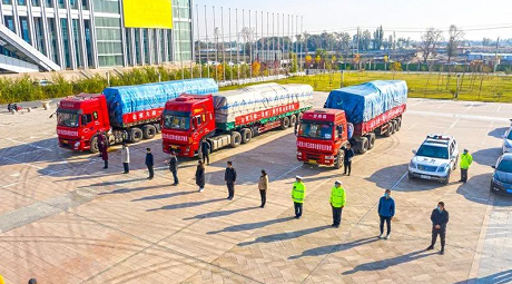 满载着18000条新疆棉被的救灾物资车辆出发前往山西。李华北摄