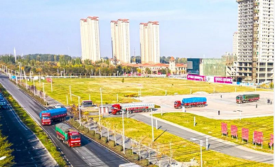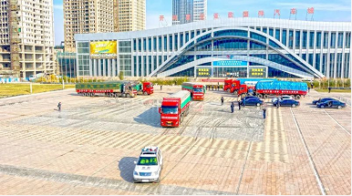 7辆满载着18000条新疆棉被的车辆准备出发前往山西。李华北摄