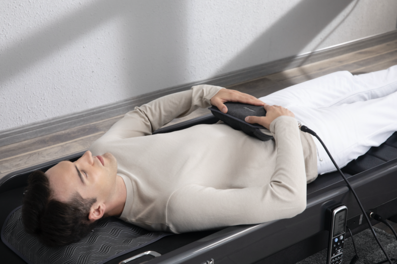 喜来健按摩床会在你躺下时,按规律挤压、推动肌肉,从而实现按摩的效果。