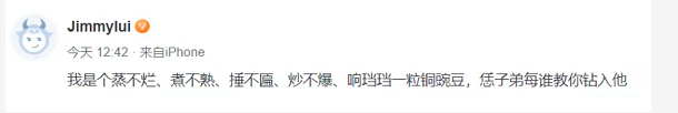 12:42,吕建明发了一长段文字,把自己比作一粒铜豌豆,蒸不烂、煮不熟、捶不匾、炒不爆、响珰珰。